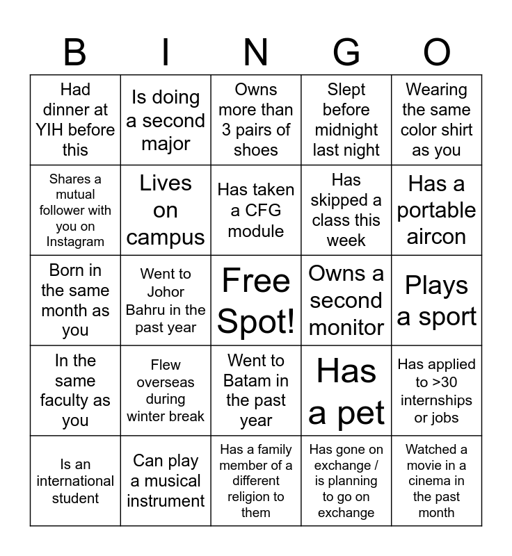 This bingo card has a free space and 24 words: Flew overseas during winter break, Can play a musical instrument, Has taken a CFG module, Is an international student, Wearing the same color shirt as you, Had dinner at YIH before this, Shares a mutual follower with you on Instagram, Is doing a second major, Owns a second monitor, Went to Batam in the past year, Has skipped a class this week, Born in the same month as you, Has a pet, Has applied to >30 internships or jobs, Lives on campus, Has gone on exchange / is planning to go on exchange, Plays a sport, Owns more than 3 pairs of shoes, Has a portable aircon, Went to Johor Bahru in the past year, Watched a movie in a cinema in the past month, In the same faculty as you, Slept before midnight last night and Has a family member of a different religion to them.