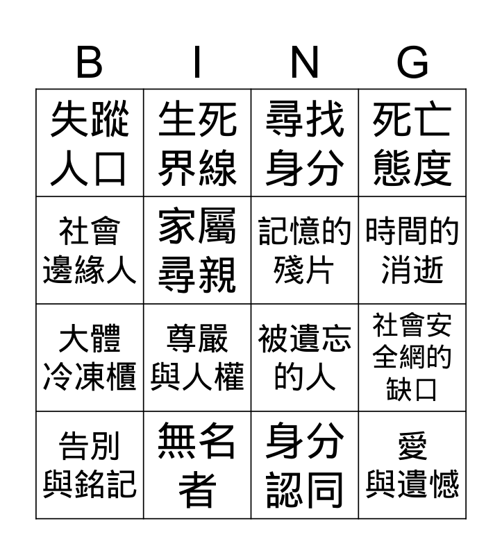 This bingo card has 16 words: 無名者, 社會安全網的缺口, 尋找 身分, 失蹤 人口, 大體 冷凍櫃, 生死 界線, 被遺忘的人, 身分 認同, 社會 邊緣人, 家屬 尋親, 告別 與銘記, 死亡 態度, 尊嚴 與人權, 時間的 消逝, 記憶的 殘片 and 愛 與遺憾.