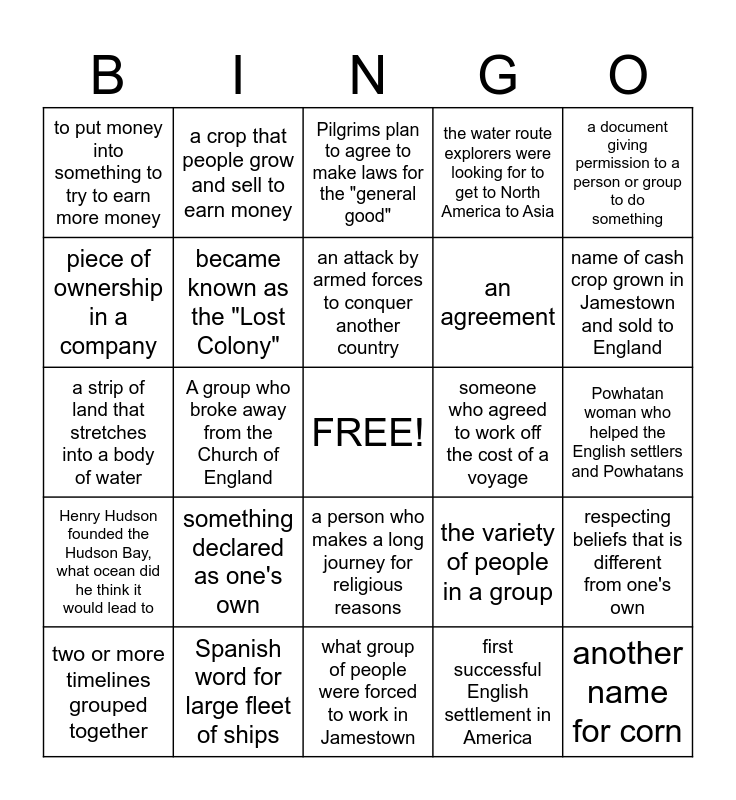 This bingo card has a free space and 24 words: something declared as one's own, Spanish word for large fleet of ships, an attack by armed forces to conquer another country, two or more timelines grouped together, a document giving permission to a person or group to do something, to put money into something to try to earn more money, piece of ownership in a company, a crop that people grow and sell to earn money, someone who agreed to work off the cost of a voyage, a person who makes a long journey for religious reasons, an agreement, a strip of land that stretches into a body of water, the variety of people in a group, respecting beliefs that is different from one's own, became known as the "Lost Colony", first successful English settlement in America, Powhatan woman who helped the English settlers and Powhatans, Pilgrims plan to agree to make laws for the "general good", name of cash crop grown in Jamestown and sold to England, A group who broke away from the Church of England, another name for corn, Henry Hudson founded the Hudson Bay, what ocean did he think it would lead to, the water route explorers were looking for to get to North America to Asia and what group of people were forced to work in Jamestown.