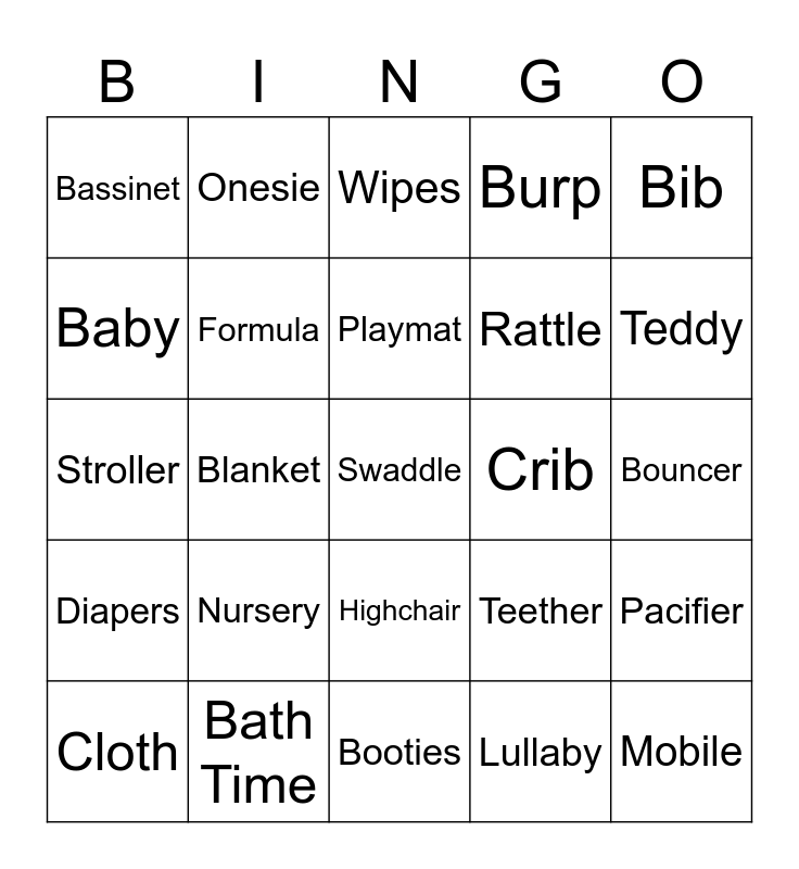 This bingo card has 27 words: Teether, Mobile, Rattle, Booties, Baby, Wipes, Onesie, Diapers, Crib, Pacifier, Stroller, Burp, Cloth, Bath Time, Teddy, Bear, Formula, Playmat, Nursery, Bassinet, Bouncer, Lullaby, Blanket, Swaddle, Highchair, Bib and Bottle.