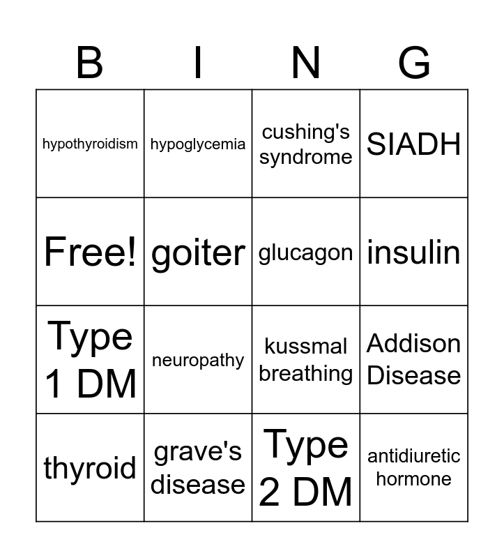 This bingo card has 16 words: grave's disease, Addison Disease, cushing's syndrome, hypothyroidism, Type 1 DM, hypoglycemia, kussmal breathing, Type 2 DM, Free!, goiter, thyroid, SIADH, neuropathy, insulin, glucagon and antidiuretic hormone.
