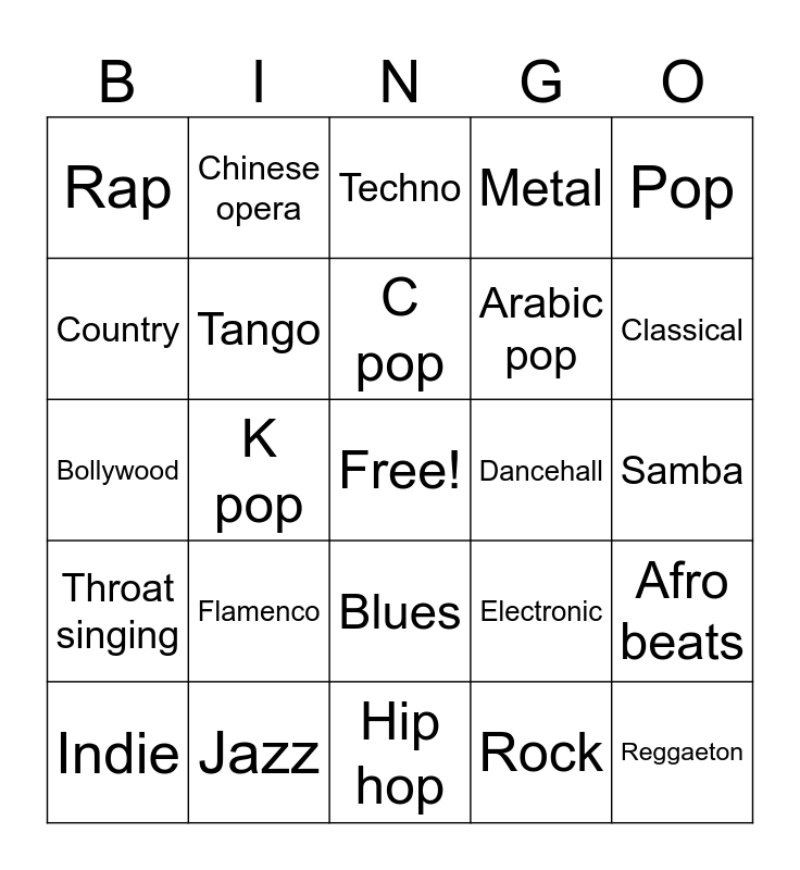 This bingo card has a free space and 24 words: Flamenco, Jazz, C pop, Indie, Pop, Rap, Country, Chinese opera, Dancehall, Blues, Arabic pop, Bollywood, Electronic, Afro beats, Tango, Rock, Samba, Techno, Classical, K pop, Reggaeton, Throat singing, Metal and Hip hop.