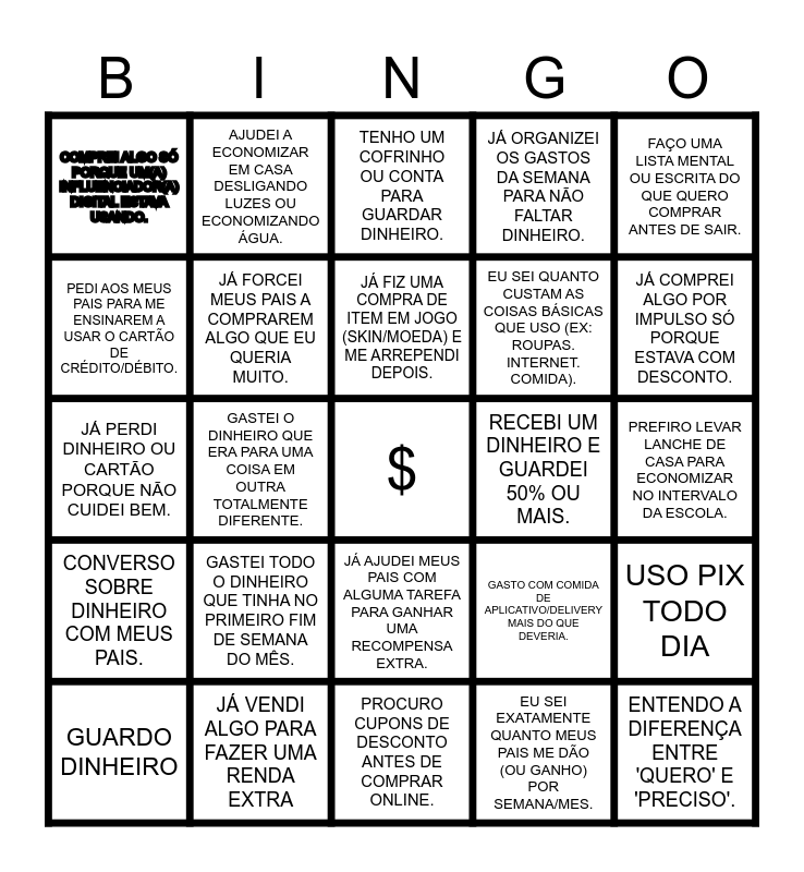 This bingo card has a free space and 24 words: GUARDO DINHEIRO, GASTEI TODO O DINHEIRO QUE TINHA NO PRIMEIRO FIM DE SEMANA DO MÊS., JÁ FIZ UMA COMPRA DE ITEM EM JOGO (SKIN/MOEDA) E ME ARREPENDI DEPOIS., EU SEI EXATAMENTE QUANTO MEUS PAIS ME DÃO (OU GANHO) POR SEMANA/MES., FAÇO UMA LISTA MENTAL OU ESCRITA DO QUE QUERO COMPRAR ANTES DE SAIR., COMPREI ALGO SÓ PORQUE UM(A) INFLUENCIADOR(A) DIGITAL ESTAVA USANDO., AJUDEI A ECONOMIZAR EM CASA DESLIGANDO LUZES OU ECONOMIZANDO ÁGUA., TENHO UM COFRINHO OU CONTA PARA GUARDAR DINHEIRO., RECEBI UM DINHEIRO E GUARDEI 50% OU MAIS., PREFIRO LEVAR LANCHE DE CASA PARA ECONOMIZAR NO INTERVALO DA ESCOLA., JÁ PERDI DINHEIRO OU CARTÃO PORQUE NÃO CUIDEI BEM., JÁ FORCEI MEUS PAIS A COMPRAREM ALGO QUE EU QUERIA MUITO., GASTO COM COMIDA DE APLICATIVO/DELIVERY MAIS DO QUE DEVERIA., USO PIX TODO DIA, PEDI AOS MEUS PAIS PARA ME ENSINAREM A USAR O CARTÃO DE CRÉDITO/DÉBITO., JÁ VENDI ALGO PARA FAZER UMA RENDA EXTRA, PROCURO CUPONS DE DESCONTO ANTES DE COMPRAR ONLINE., JÁ ORGANIZEI OS GASTOS DA SEMANA PARA NÃO FALTAR DINHEIRO., JÁ COMPREI ALGO POR IMPULSO SÓ PORQUE ESTAVA COM DESCONTO., CONVERSO SOBRE DINHEIRO COM MEUS PAIS., GASTEI O DINHEIRO QUE ERA PARA UMA COISA EM OUTRA TOTALMENTE DIFERENTE., JÁ AJUDEI MEUS PAIS COM ALGUMA TAREFA PARA GANHAR UMA RECOMPENSA EXTRA., EU SEI QUANTO CUSTAM AS COISAS BÁSICAS QUE USO (EX: ROUPAS. INTERNET. COMIDA). and ENTENDO A DIFERENÇA ENTRE 'QUERO' E 'PRECISO'..