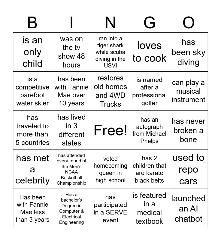 This bingo card has a free space and 24 words: has attended every round of the Men's NCAA Basketball Championship, Has a bachelor's Degree in Computer & Electrical Engineering, restores old homes and 4WD Trucks, Has been with Fannie Mae less than 3 years, has been sky diving, is an only child, is a competitive barefoot water skier, was on the tv show 48 hours, has an autograph from Michael Phelps, voted homecoming queen in high school, is named after a professional golfer, has traveled to more than 5 countries, has 2 children that are karate black belts, used to repo cars, has been with Fannie Mae over 10 years, is featured in a medical textbook, has never broken a bone, ran into a tiger shark while scuba diving in the USVI, can play a musical instrument, has lived in 3 different states, launched an AI chatbot, has met a celebrity, loves to cook and has participated in a SERVE event.