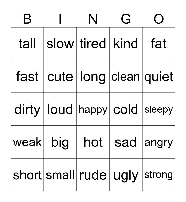 This bingo card has a free space and 24 words: big, small, long, short, fat, tall, fast, slow, cold, hot, clean, dirty, sad, angry, cute, ugly, sleepy, tired, quiet, loud, strong, weak, kind and rude.