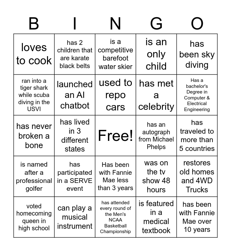 This bingo card has a free space and 24 words: has participated in a SERVE event, can play a musical instrument, used to repo cars, voted homecoming queen in high school, has been sky diving, loves to cook, ran into a tiger shark while scuba diving in the USVI, has 2 children that are karate black belts, has an autograph from Michael Phelps, Has been with Fannie Mae less than 3 years, has met a celebrity, has never broken a bone, was on the tv show 48 hours, restores old homes and 4WD Trucks, launched an AI chatbot, is featured in a medical textbook, has traveled to more than 5 countries, is a competitive barefoot water skier, Has a bachelor's Degree in Computer & Electrical Engineering, has lived in 3 different states, has been with Fannie Mae over 10 years, is named after a professional golfer, is an only child and has attended every round of the Men's NCAA Basketball Championship.
