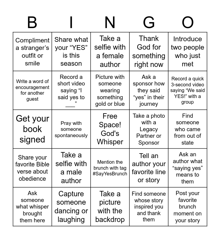This bingo card has a free space and 24 words: Take a selfie with a male author, Capture someone dancing or laughing, Picture with someone wearing something gold or blue, Ask someone what whisper brought them here, Introduce two people who just met, Compliment a stranger’s outfit or smile, Write a word of encouragement for another guest, Share what your “YES” is this season, Take a photo with a Legacy Partner or Sponsor, Mention the brunch with tag #SayYesBrunch, Ask a sponsor how they said “yes” in their journey, Get your book signed, Tell an author your favorite line or story, Ask an author what “saying yes” means to them, Record a short video saying “I said yes to ___”, Find someone whose story inspired you and thank them, Find someone who came from out of state, Take a selfie with a female author, Record a quick 3-second video saying “We said YES!” with a group, Pray with someone spontaneously, Post your favorite brunch moment on your story, Share your favorite Bible verse about obedience, Thank God for something right now and Take a picture with the backdrop.