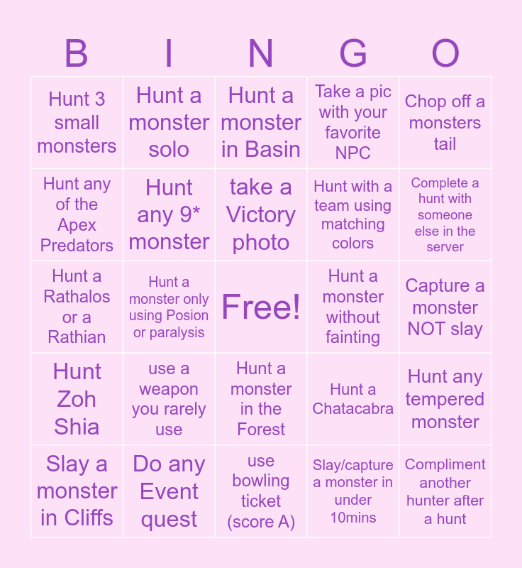 This bingo card has a free space and 24 words: Slay a monster in Cliffs, use a weapon you rarely use, take a Victory photo, Slay/capture a monster in under 10mins, Chop off a monsters tail, Hunt 3 small monsters, Hunt a monster solo, Hunt a monster in Basin, Hunt a monster without fainting, Capture a monster NOT slay, Hunt a Rathalos or a Rathian, Hunt any 9* monster, Hunt a Chatacabra, Hunt any tempered monster, Hunt any of the Apex Predators, Do any Event quest, use bowling ticket (score A), Take a pic with your favorite NPC, Complete a hunt with someone else in the server, Hunt Zoh Shia, Hunt a monster only using Posion or paralysis, Hunt a monster in the Forest, Hunt with a team using matching colors and Compliment another hunter after a hunt.