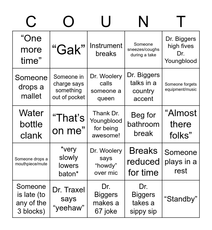 This bingo card has a free space and 31 words: Dr. Biggers makes a 67 joke, “False start”, “That’s on me”, Hit 50 takes, “One more time”, Instrument breaks, Someone in charge says something out of pocket, Breaks reduced for time, Beg for bathroom break, Dr. Biggers takes a sippy sip, “Almost there folks”, “Standby”, You finish a whole water bottle, Your phone/ipad goes below 50%, Someone forgets equipment/music, Dr. Biggers tells a dad joke, Someone plays in a rest, *very slowly lowers baton*, Someone drops a mouthpiece/mute, Dr. Woolery says “howdy” over mic, Dr. Biggers high fives Dr. Youngblood, Dr. Youngblood asks for a faster tempo, Someone is late (to any of the 3 blocks), “Gak”, Dr. Biggers talks in a country accent, Someone drops a mallet, Someone sneezes/coughs during a take, Water bottle clank, Dr. Traxel says “yeehaw”, Dr. Woolery calls someone a queen and “Count!”.