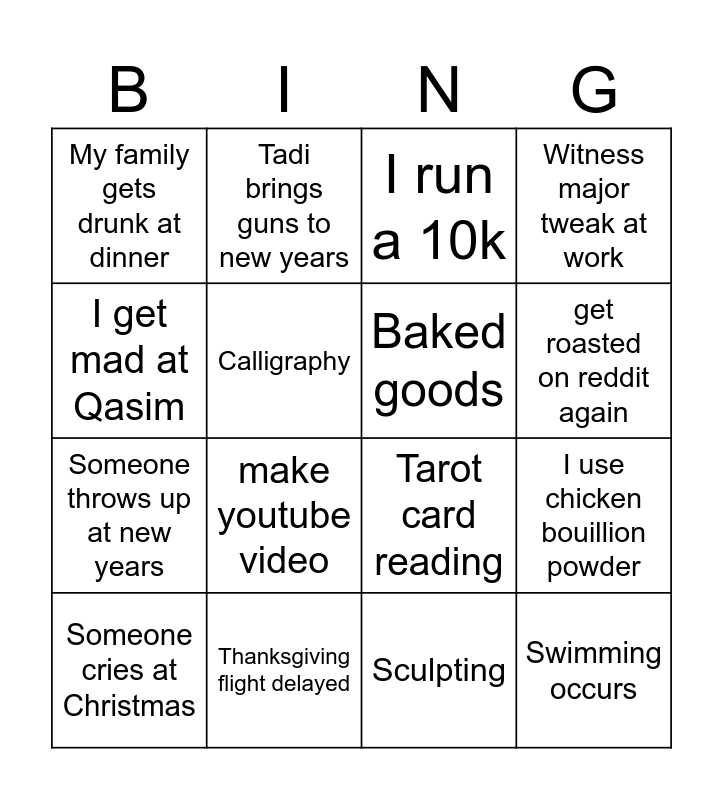 This bingo card has 16 words: Thanksgiving flight delayed, I use chicken bouillion powder, I run a 10k, My family gets drunk at dinner, Someone throws up at new years, Tadi brings guns to new years, Tarot card reading, Sculpting, I get mad at Qasim, Calligraphy, Someone cries at Christmas, Witness major tweak at work, make youtube video, get roasted on reddit again, Baked goods and Swimming occurs.