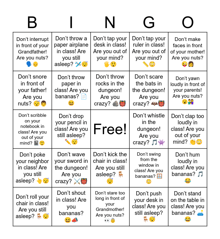 This bingo card has a free space and 30 words: Don’t shout in class! Are you bananas? 😆📣, Don’t swing your backpack in class! Are you out of your mind? 🎒😳, Don’t drop your pencil in class! Are you still asleep? ✏️😴, Don’t spill your drink in the dungeon! Are you crazy? 🥤👹, Don’t interrupt in front of your Grandfather! Are you nuts? 🗣️👴, Don’t tap your desk in class! Are you out of your mind? 🖐️😲, Don’t throw paper in class! Are you bananas? 📄😆, Don’t kick the chair in class! Are you still asleep? 🪑😴, Don’t whistle in the dungeon! Are you crazy? 🎵👾, Don’t stare too long in front of your Grandmother! Are you nuts? 👀👵, Don’t clap too loudly in class! Are you out of your mind? 👏😳, Don’t stand on the table in class! Are you bananas? 🛋️😂, Don’t push your desk in class! Are you still asleep? 🪑😴, Don’t roar in the dungeon! Are you crazy? 🐲👹, Don’t yawn loudly in front of your parents! Are you nuts? 😮👨👩👧, Don’t tap your pencil on the desk in class! Are you out of your mind? ✏️😆, Don’t swing from the window in class! Are you bananas? 🪟😳, Don’t poke your neighbor in class! Are you still asleep? 👆😴, Don’t wave your sword in the dungeon! Are you crazy? ⚔️👹, Don’t make faces in front of your mother! Are you nuts? 😜👩, Don’t scribble on your notebook in class! Are you out of your mind? 📓😲, Don’t stomp on the floor in class! Are you bananas? 👣😂, Don’t throw a paper airplane in class! Are you still asleep? 🛩️😴, Don’t scare the bats in the dungeon! Are you crazy? 🦇👹, Don’t snore in front of your father! Are you nuts? 😴👨, Don’t tap your ruler in class! Are you out of your mind? 📏😳, Don’t hum loudly in class! Are you bananas? 🎵😂, Don’t roll your chair in class! Are you still asleep? 🪑😴, Don’t throw rocks in the dungeon! Are you crazy? 🪨👹 and Don’t scratch your head in front of your Grandmother! Are you nuts? 🤔👵.