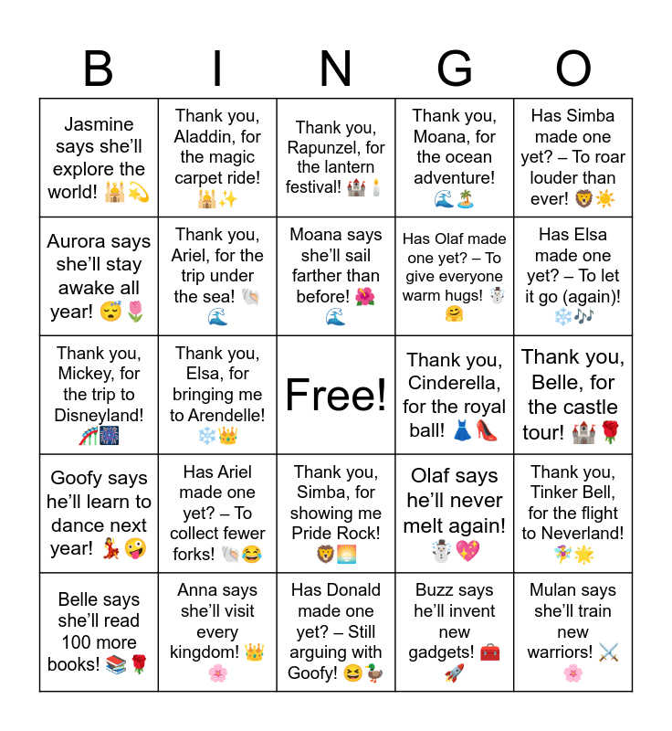 This bingo card has a free space and 33 words: Has Mickey made a New Yearβs resolution yet? β Yes, to make more magic! π©π, Minnie says sheβll start a cupcake shop! π§π, Thank you, Elsa, for bringing me to Arendelle! βοΈπ, Has Donald made one yet? β No, heβs still quacking about it! π¦π, Goofy says heβll learn to dance next year! ππ€ͺ, Thank you, Ariel, for the trip under the sea! ππ, Has Simba made one yet? β To roar louder than ever! π¦βοΈ, Belle says sheβll read 100 more books! ππΉ, Thank you, Aladdin, for the magic carpet ride! πβ¨, Has Stitch made one yet? β Heβll behave... maybe! π½π«, Moana says sheβll sail farther than before! πΊπ, Thank you, Rapunzel, for the lantern festival! π°π―οΈ, Has Woody made one yet? β To look after his friends! π€ β, Buzz says heβll fly βto infinityβ again! ππ, Thank you, Cinderella, for the royal ball! ππ , Has Elsa made one yet? β To let it go (again)! βοΈπΆ, Anna says sheβll visit every kingdom! ππΈ, Thank you, Mickey, for the trip to Disneyland! π’π, Has Ariel made one yet? β To collect fewer forks! ππ, Olaf says heβll never melt again! βοΈπ, Thank you, Simba, for showing me Pride Rock! π¦π , Has Genie made one yet? β To take a real vacation! π§ββοΈπ΄, Jasmine says sheβll explore the world! ππ«, Thank you, Belle, for the castle tour! π°πΉ, Has Donald made one yet? β Still arguing with Goofy! ππ¦, Mulan says sheβll train new warriors! βοΈπΈ, Thank you, Moana, for the ocean adventure! πποΈ, Has Olaf made one yet? β To give everyone warm hugs! βοΈπ€, Aurora says sheβll stay awake all year! π΄π·, Thank you, Tinker Bell, for the flight to Neverland! π§ββοΈπ, Has Woody made one yet? β To be the best cowboy! π€ π΄, Buzz says heβll invent new gadgets! π§°π and Thank you, Elsa, for the snow day fun! βοΈπ.
