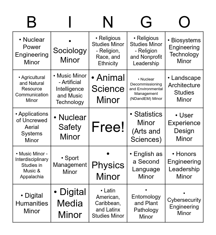 This bingo card has a free space and 182 words: Advertising and Public Relations Minor • Aerospace Engineering Minor • Africana Studies Minor • Agricultural and Natural Resource Communication Minor • Agricultural Business Minor • Agricultural Extension Minor • Agricultural Leadership Mino, Advertising and Public Relations Minor, • Aerospace Engineering Minor, • Africana Studies Minor, • Agricultural and Natural Resource Communication Minor, • Agricultural Business Minor, • Agricultural Extension Minor, • Agricultural Leadership Minor, • Air Force Aerospace Studies Minor, • American Civics Minor, • American Sign Language Minor, • Animal Behavior Minor, • Animal Science Minor, • Anthropology Minor, • Applications of Uncrewed Aerial Systems Minor, • Applied Artificial Intelligence Minor, • Applied Computing Minor, • Applied Cybersecurity Minor, • Arab Studies Minor, • Architectural Studies Minor, • Art Education Minor, • Art History Minor, • Asian Studies Minor, • Astronomy Minor, • Bioinformatics Minor, • Biological Sciences Minor, • Biomedical Engineering Minor, • Biomedical Research in Nutrition Minor, • Biosystems Engineering Technology Minor, • Broadcast Meteorology Minor, • Business Administration Minor, • Chancellor’s Honors Program Minor, • Chemistry Minor, • Chinese Minor, • Cinema Studies Minor, • Classical Archaeology Minor, • Classical Civilization Minor, • Classical Languages Minor, • Climate Change Minor, • Communication Studies Minor, • Computational Social Sciences Minor, • Computer Science Minor, • Corporate Event Strategy, Promotion, and Production Minor, • Counseling and Human Services Minor, • Culinary Arts Minor, • Cybersecurity Engineering Minor, • Cybersecurity Minor, • Data Science Minor, • Datacenter Technology and Management Minor, • Design Studies Minor, • Digital Humanities Minor, • Digital Media Minor, • Ecology and Evolutionary Biology Minor, • Economics Minor (Arts and Sciences), • Engineering Entrepreneurship Minor, • Engineering for Sustainability Minor, • Engineering Management Minor, • English as a Second Language Minor, • English Minor, • English Minor - Technical Communication, • Entomology and Plant Pathology Minor, • Entrepreneurship Minor, • Environmental and Soil Sciences Minor, • Environmental Engineering Minor, • Environmental Sociology Minor, • Environmental Studies Minor, • Event Planning and Design Minor, • Food Fermentation Minor, • Food Science Minor, • Forest Industry Minor, • Forestry Minor, • French and Francophone Studies Minor, • Geochemistry Minor, • Geographic Information Science Minor, • Geography Minor, • Geology Minor, • German Minor, • Global Development Minor, • Global Studies Minor, • Graphic Design Studies Minor, • Greek Minor, • Haslam Leadership Scholars Minor, • Heath Integrated Business & Engineering Program Minor, • Hebrew Minor, • Hispanic Studies Minor, • History Minor, • History of Science, Medicine, and Technology Minor, • Honors Engineering Leadership Minor, • Honors Food, Agricultural, Natural Resource, and Human Sciences Minor, • Hospitality and Tourism Management Minor, • Human Development and Family Science Minor, • Human-Intelligent Systems Interaction Minor, • Industrial Design Studies Minor, • Information Sciences Minor, • Interior Architecture Studies Minor, • International Agriculture and Natural Resources Minor, • Interpersonal Skills Minor, • Italian Minor, • Japanese Minor, • Jewish Studies Minor, • Journalism and Media Minor, • Justice Studies Minor, • Landscape Architecture Studies Minor, • Latin American, Caribbean, and Latinx Studies Minor, • Latin Minor, • Leadership Studies Minor, • Leadership Studies Minor - Honors, • Linguistics Minor, • Machine Learning Minor, • Materials Science and Engineering Minor, • Mathematics Honors Minor, • Mathematics Minor, • Mechanical Engineering Minor, • Medieval and Renaissance Studies Minor, • Middle East Studies Minor, • Molecular Biophysics Minor, • Museum and Curatorial Studies Minor, • Music Minor - Applied Music, • Music Minor - Artificial Intelligence and Music Technology, • Music Minor - Data Science and Music Technology, • Music Minor - Interdisciplinary Studies in Music & Appalachia, • Music Minor - Interdisciplinary Studies in Music & Asia, • Music Minor - Music & the African Diaspora, • Music Minor - Music and Culture, • Music Minor - Music Business, • Music Minor - Music Composition, • Music Minor - Music Technology, • Music Minor - Music Theory, • Musical Theatre Minor, • Natural Resource and Environmental Economics Minor, • Neuroscience Minor, • Nuclear Decommissioning and Environmental Management (NDandEM) Minor, • Nuclear Deterrence Minor, • Nuclear Power Engineering Minor, • Nuclear Safety Minor, • Nuclear Security Policy for Engineers Minor, • Nutrition and Physical Activity for Health Minor, • Nutrition Minor, • One Health Minor, • Paleontology Minor, • Philosophy Minor, • Philosophy of Science and Medicine Minor, • Physics Minor, • Plant Sciences Minor, • Political Science Minor, • Portuguese Minor, • Pre-Health Professions Minor, • Psychology Minor, • Public Affairs Minor, • Public Health Minor, • Public Health Minor - Five-Year BS or BA/MPH Program, • Public Policy Analytics Minor, • Reliability and Maintainability Engineering Minor, • Religious Studies Minor, • Religious Studies Minor - Religion and Nonprofit Leadership, • Religious Studies Minor - Religion, Race, and Ethnicity, • Reserve Officers Training Corps (ROTC) Minor, • Retail and Merchandising Management Minor, • Russian Literature in Translation Minor, • Russian Studies Minor, • Science, Technology, Health, and Society Minor, • SCUBA Minor, • Secondary Edu