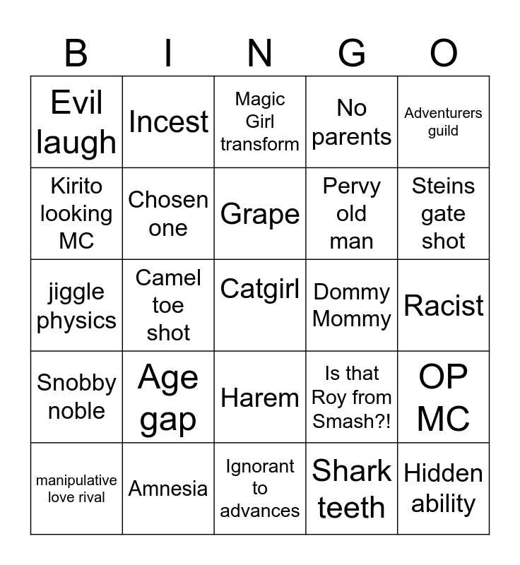 This bingo card has a free space and 24 words: Age gap, Amnesia, Grape, manipulative love rival, Adventurers guild, Evil laugh, Kirito looking MC, Incest, Dommy Mommy, Harem, Pervy old man, jiggle physics, Is that Roy from Smash?!, OP MC, Chosen one, Shark teeth, Racist, Magic Girl transform, Steins gate shot, Camel toe shot, Hidden ability, Snobby noble, No parents and Ignorant to advances.