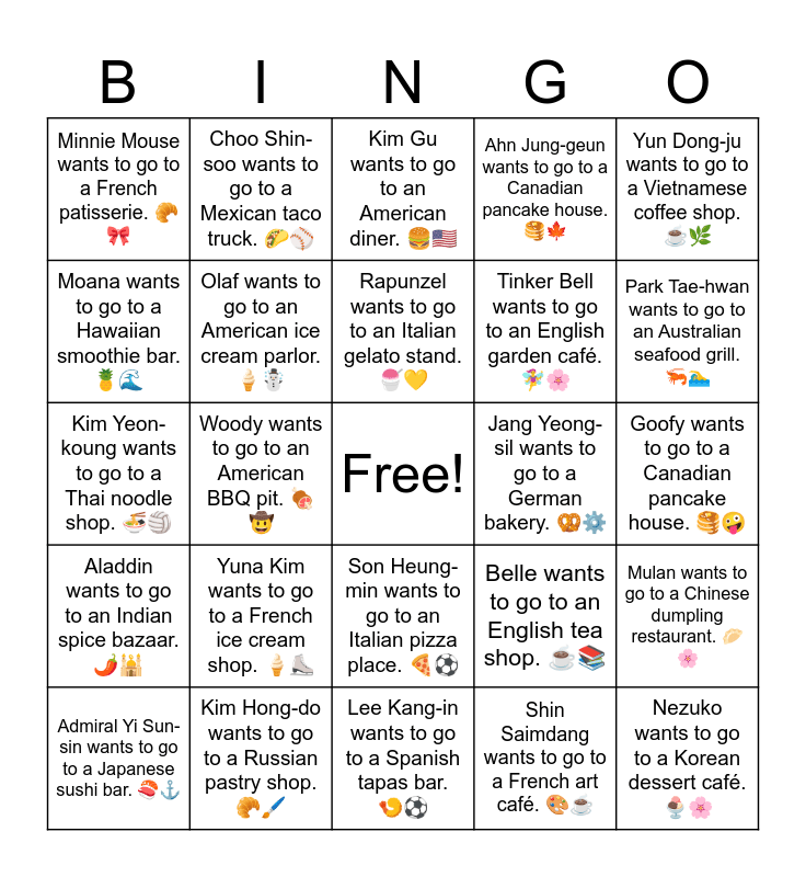 This bingo card has a free space and 43 words: Tanjiro wants to go to a Japanese ramen shop. 🍜🔥, Nezuko wants to go to a Korean dessert café. 🍨🌸, King Sejong wants to go to a Chinese tea house. 🍵📜, Admiral Yi Sun-sin wants to go to a Japanese sushi bar. 🍣⚓, Queen Seondeok wants to go to an Italian bakery. 🍰👑, Shin Saimdang wants to go to a French art café. 🎨☕, Kim Gu wants to go to an American diner. 🍔🇺🇸, Heo Jun wants to go to an Indian spice market. 🌶️📖, Yun Dong-ju wants to go to a Vietnamese coffee shop. ☕🌿, Kim Hong-do wants to go to a Russian pastry shop. 🥐🖌️, Ahn Jung-geun wants to go to a Canadian pancake house. 🥞🍁, Jang Yeong-sil wants to go to a German bakery. 🥨⚙️, Son Heung-min wants to go to an Italian pizza place. 🍕⚽, Yuna Kim wants to go to a French ice cream shop. 🍦⛸️, Park Ji-sung wants to go to an English breakfast café. ☕🥞, Lee Kang-in wants to go to a Spanish tapas bar. 🍤⚽, Ryu Hyun-jin wants to go to an American BBQ joint. 🍖⚾, Kim Yeon-koung wants to go to a Thai noodle shop. 🍜🏐, Lee Da-bin wants to go to a Korean snack stand. 🍢🥋, Park Tae-hwan wants to go to an Australian seafood grill. 🦐🏊♂️, Choo Shin-soo wants to go to a Mexican taco truck. 🌮⚾, Hwang Sun-woo wants to go to a Japanese dessert café. 🍰🏊♂️, Mickey Mouse wants to go to an Italian pasta restaurant. 🍝🐭, Minnie Mouse wants to go to a French patisserie. 🥐🎀, Donald Duck wants to go to an American burger diner. 🍔🦆, Goofy wants to go to a Canadian pancake house. 🥞🤪, Pluto wants to go to a Mexican taco stand. 🌮🐾, Ariel wants to go to a seafood restaurant (but not eat fish!). 🐚😅, Belle wants to go to an English tea shop. ☕📚, Aladdin wants to go to an Indian spice bazaar. 🌶️🕌, Elsa wants to go to a Norwegian ice café. ❄️☕, Mulan wants to go to a Chinese dumpling restaurant. 🥟🌸, Simba wants to go to an African grill. 🦁🔥, Woody wants to go to an American BBQ pit. 🍖🤠, Buzz Lightyear wants to go to a futuristic space café. 🚀☕, Cinderella wants to go to a French bakery. 🥖👗, Snow White wants to go to a German apple pie shop. 🍎🍰, Rapunzel wants to go to an Italian gelato stand. 🍧💛, Moana wants to go to a Hawaiian smoothie bar. 🍍🌊, Tinker Bell wants to go to an English garden café. 🧚♀️🌸, Stitch wants to go to a Hawaiian snack shack. 🍧👽, Olaf wants to go to an American ice cream parlor. 🍦☃️ and Genie wants to go to a Middle Eastern dessert shop. 🍮🧞♂️.