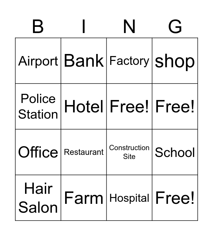 This bingo card has 17 words: Hospital, Hair Salon, Factory, Airport, Restaurant, shop, School, Free!, Free!, Hotel, Farm, Construction Site, Police Station, Bank, Office, Free! and Free!.
