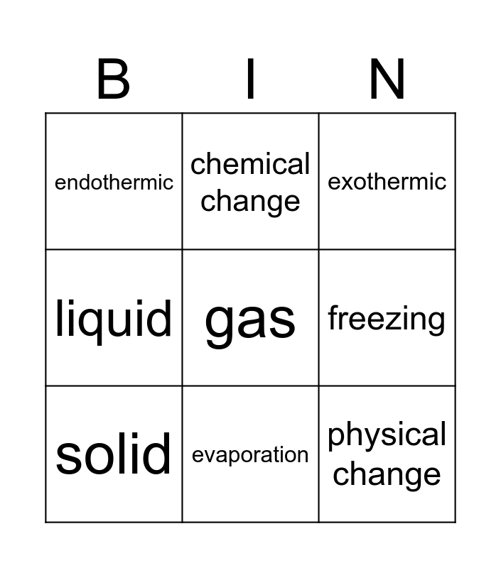 This bingo card has a free space and 8 words: freezing, exothermic, chemical change, solid, endothermic, physical change, liquid and evaporation.