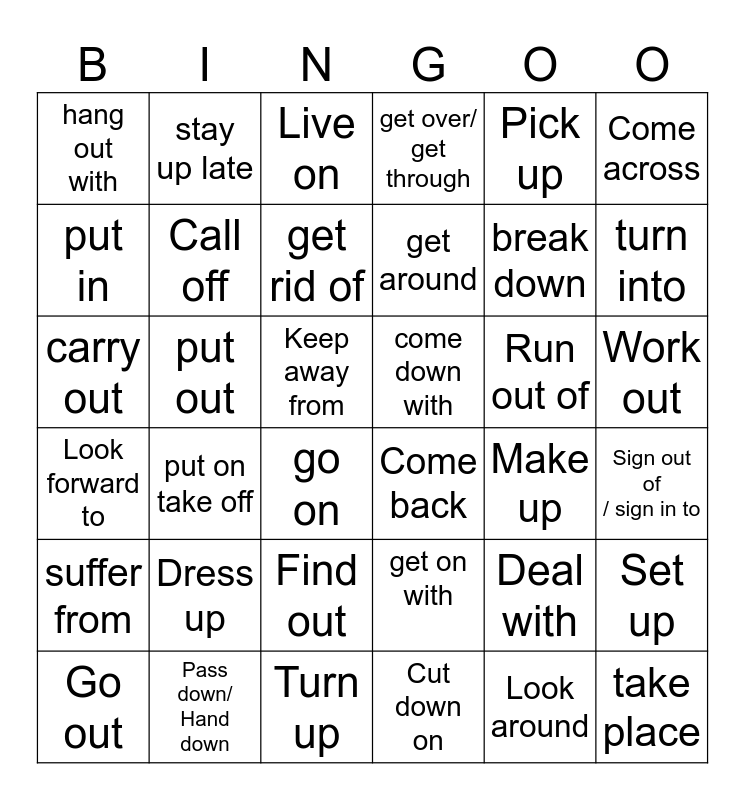 This bingo card has 36 words: get on with, Find out, Cut down on, put in, Look forward to, come down with, Call off, Turn up, Pick up, Deal with, turn into, get over/ get through, Set up, put out, get around, hang out with, suffer from, Run out of, carry out, Live on, Keep away from, put on take off, Come back, go on, Make up, stay up late, break down, Pass down/ Hand down, get rid of, Come across, take place, Go out, Sign out of / sign in to, Work out, Dress up and Look around.