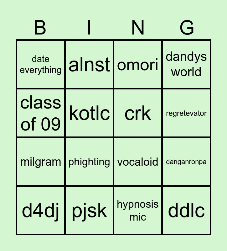 This bingo card has 16 words: pjsk, danganronpa, omori, date everything, milgram, alnst, vocaloid, hypnosis mic, class of 09, kotlc, d4dj, dandys world, phighting, regretevator, crk and ddlc.