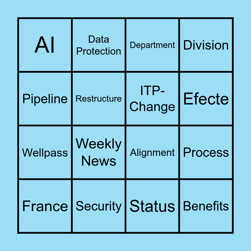 This bingo card has 16 words: Security, Process, Department, AI, Wellpass, Data Protection, Alignment, Status, Pipeline, Restructure, France, Division, Weekly News, Efecte, ITP-Change and Benefits.