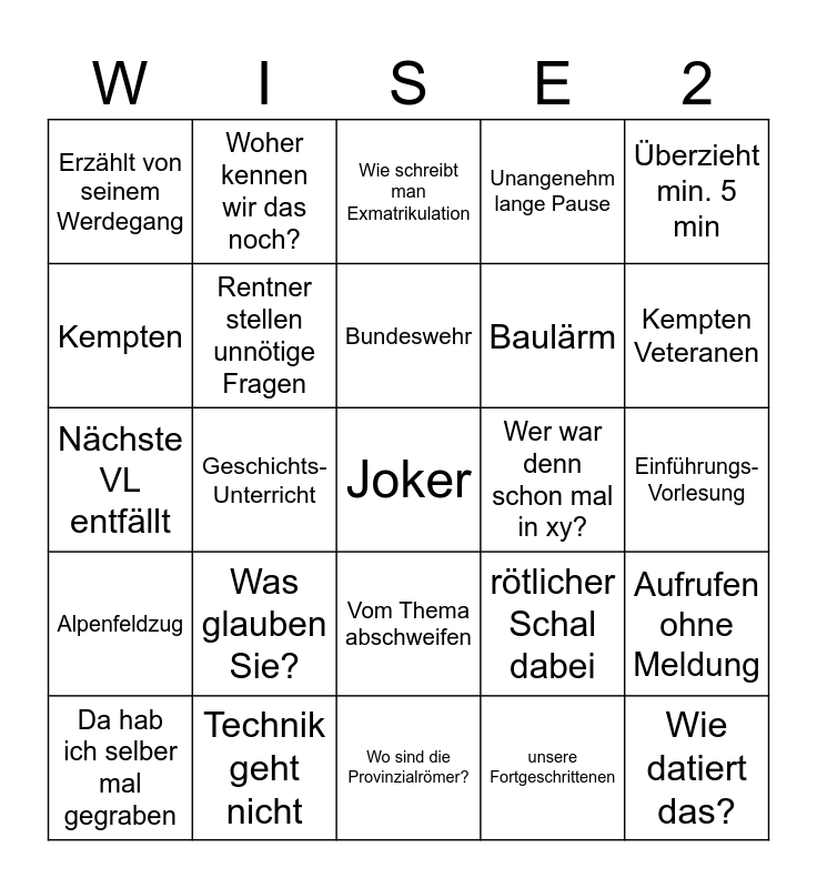 This bingo card has a free space and 24 words: Was glauben Sie?, Technik geht nicht, Bundeswehr, Da hab ich selber mal gegraben, Überzieht min. 5 min, Erzählt von seinem Werdegang, Kempten, Woher kennen wir das noch?, Wer war denn schon mal in xy?, Vom Thema abschweifen, Baulärm, Nächste VL entfällt, rötlicher Schal dabei, Aufrufen ohne Meldung, Rentner stellen unnötige Fragen, unsere Fortgeschrittenen, Einführungs-Vorlesung, Wie schreibt man Exmatrikulation, Kempten Veteranen, Geschichts-Unterricht, Wie datiert das?, Alpenfeldzug, Unangenehm lange Pause and Wo sind die Provinzialrömer?.