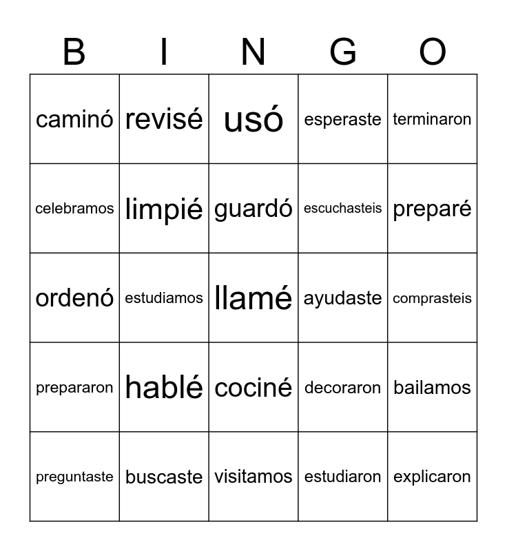This bingo card has 25 words: hablé, visitamos, guardó, preguntaste, terminaron, caminó, celebramos, revisé, ayudaste, cociné, escuchasteis, ordenó, decoraron, bailamos, limpié, explicaron, comprasteis, usó, preparé, estudiamos, llamé, buscaste, prepararon, esperaste and estudiaron.