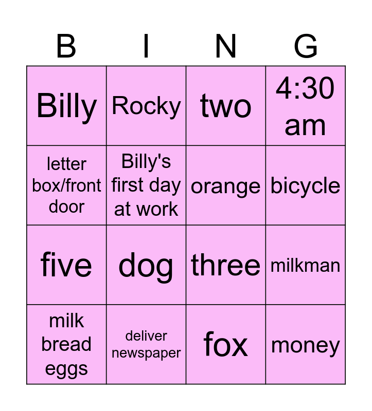 This bingo card has 16 words: deliver newspaper, milkman, two, Billy, five, Rocky, three, fox, letter box/front door, Billy's first day at work, milk bread eggs, 4:30 am, dog, bicycle, orange and money.