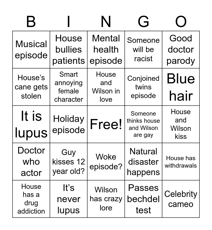This bingo card has a free space and 24 words: Guy kisses 12 year old?, It’s never lupus, House and Wilson in love, House has a drug addiction, Good doctor parody, Musical episode, House’s cane gets stolen, House bullies patients, Someone thinks house and Wilson are gay, Woke episode?, Conjoined twins episode, It is lupus, Natural disaster happens, House has withdrawals, Smart annoying female character, Passes bechdel test, House and Wilson kiss, Mental health episode, Blue hair, Holiday episode, Celebrity cameo, Doctor who actor, Someone will be racist and Wilson has crazy lore.