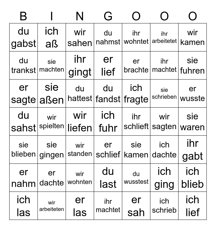 This bingo card has 49 words: ich ging, ihr machtet, er sah, wir spielten, du hattest, sie waren, ich aß, er las, ihr arbeitetet, er schlief, wir kamen, du nahmst, sie schrieben, ich fragte, er dachte, wir sagten, du trankst, sie fuhren, ich blieb, ihr wohntet, er brachte, wir liefen, du gabst, sie machten, ich las, ihr gingt, er wusste, wir arbeiteten, du fandst, sie aßen, ich lief, ihr schlieft, er nahm, wir wohnten, du sahst, sie kamen, ich dachte, ihr gabt, er sagte, wir standen, du last, sie blieben, ich fuhr, ihr machtet, er lief, wir sahen, du wusstest, sie gingen and ich schrieb.