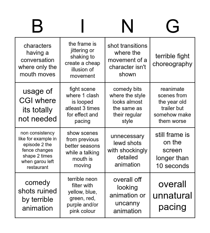 This bingo card has 16 words: terrible neon filter with yellow, blue, green, red, purple and/or pink colour, still frame is on the screen longer than 10 seconds, shot transitions where the movement of a character isn't shown, characters having a conversation where only the mouth moves, non consistency like for example in episode 2 the fence changes shape 2 times when garou left restaurant, the frame is jittering or shaking to create a cheap illusion of movement, unnecessary lewd shots with shockingly detailed animation, overall off looking animation or uncanny animation, usage of CGI where its totally not needed, fight scene where 1 clash is looped atleast 3 times for effect and pacing, comedy shots ruined by terrible animation, terrible fight choreography, show scenes from previous better seasons while a talking mouth is moving, reanimate scenes from the year old trailer but somehow make them worse, comedy bits where the style looks almost the same as their regular style and overall unnatural pacing.