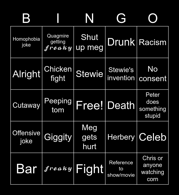 This bingo card has a free space and 24 words: Giggity, 𝓯𝓻𝓮𝓪𝓴𝔂, Stewie, Bar, Racism, Homophobia joke, Alright, Quagmire getting 𝓯𝓻𝓮𝓪𝓴𝔂, Death, Meg gets hurt, Stewie's invention, Cutaway, Herbery, Celeb, Chicken fight, Reference to show/movie, Peter does something stupid, Shut up meg, No consent, Peeping tom, Chris or anyone watching corn, Offensive joke, Drunk and Fight.