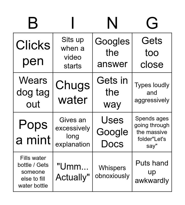 This bingo card has 21 words: "Umm... Actually", Searches something odd, Sits up when a video starts, Whips out the massive folder, Whispers obnoxiously, Gets in the way, Clicks pen, Googles the answer, Uses Google Docs, Types loudly and aggressively, Pops a mint, Gets too close, Puts hand up awkwardly, Unscrews squeaky bottle, Chugs water, Checks / Goes on his phone, Fills water bottle / Gets someone else to fill water bottle, Gives an excessively long explanation, Wears dog tag out, Spends ages going through the massive folder"Let's say" and Takes a picture on his phone.
