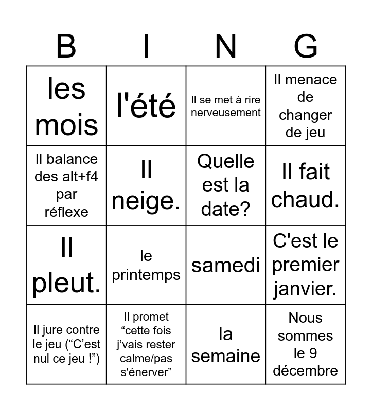 This bingo card has 44 words: Il hausse la voix sans s’en rendre compte, Il jure contre le jeu (“C’est nul ce jeu !”), Il se demande pourquoi il a encore lancé le jeux, Il dit “allez on refait une dernière” après avoir perdu, Il insulte un objet inanimé (“Ma souris bug !”), Il tape le bureau, Il se met à rire nerveusement, Il balance un "On a pas d'allier, on ne peux pas gagner", Il balance des alt+f4 par réflexe, Il supprime le jeu (encore une fois), Il menace de changer de jeu, Il promet “cette fois j’vais rester calme/pas s'énerver”, Il commence a spam qu'on peux pas gagner a cause du matchmaking, Il focus un mec en jeux "Non mais regarde ce qu'il fait lui aussi", Commence a spam "my bad" alors qu'il le pense pas, Lache des "c'est injouable", vendredi, samedi, dimanche, le printemps, l'été, l'automne, l'hiver, les mois, les jours, la semaine, l'année, les saisons, aujourd'hui, Nous sommes le 9 décembre, Quel jour est-ce?, Quel temps fait-il?, Demain, c'est le 10 décembre, à lundi!, C'est le premier janvier., Il fait beau., Il fait mauvais., Il fait froid., Il fait chaud., Il neige., Il pleut., demain, Quelle est la date? and Ma saison favorite est....