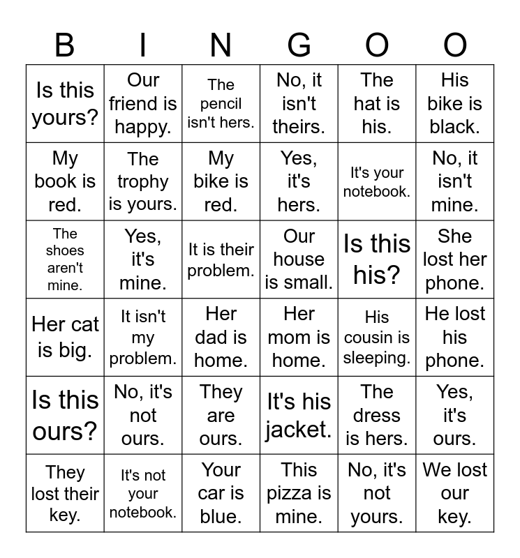 This bingo card has 36 words: It's his jacket., They are ours., This pizza is mine., My book is red., Her cat is big., Our house is small., The trophy is yours., Your car is blue., The hat is his., The dress is hers., No, it isn't mine., No, it isn't theirs., Yes, it's ours., Yes, it's mine., Yes, it's hers., Is this yours?, Is this ours?, Is this his?, The shoes aren't mine., The pencil isn't hers., It is their problem., It isn't my problem., Her mom is home., Her dad is home., His cousin is sleeping., Our friend is happy., It's your notebook., It's not your notebook., My bike is red., His bike is black., We lost our key., They lost their key., He lost his phone., She lost her phone., No, it's not ours. and No, it's not yours..