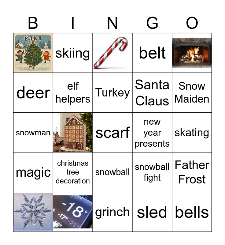 This bingo card has 6 images, a free space and 18 words: christmas tree decoration, Turkey, deer, skiing, new year presents, snowball, Santa Claus, snowman, snowball fight, Father Frost, elf helpers, sled, skating, Snow Maiden, bells, magic, belt and grinch.