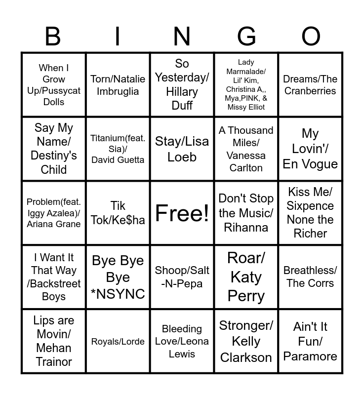 This bingo card has a free space and 65 words: Believe/ Cher, That Don't Impress Me Much/ Shania Twain, This Kiss/Faith Hill, Breathless/ The Corrs, Hold On/ Wilson Phillips, Black Velvet/ Allanah Myles, Torn/Natalie Imbruglia, No One/Alicia Keys, Stay/Lisa Loeb, If It Makes You Happy/ Sheryl Crow, Shoop/Salt -N-Pepa, Nothing Compares/ Sinead O'Connor, Kiss Me/ Sixpence None the Richer, Dreams/The Cranberries, Dancing Queen/ ABBA, Say My Name/ Destiny's Child, Tik Tok/Ke$ha, When I Grow Up/Pussycat Dolls, Cowboy Take Me Away/Dixie Chicks, A Thousand Miles/ Vanessa Carlton, Bye Bye Bye *NSYNC, I Want It That Way /Backstreet Boys, Lady Marmalade/ Lil' Kim, Christina A,, Mya,PINK, & Missy Elliot, Fighter/ Christina Aguilera, Halo/ Beyonce, Perfect Day/Hoku, Everywhere/ Michelle Branch, Shake It Off/Taylor Swift, Ain't It Fun/ Paramore, Since U Been Gone/Kelly Clarkson, Lips are Movin/ Mehan Trainor, Rolling in the Deep/ Adele, New Rules/ Dua Lipa, Chandelier/ Sia, Roar/ Katy Perry, Royals/Lorde, Wrecking Ball/ Miley Cyrus, Problem(feat. Iggy Azalea)/ Ariana Grane, Stronger/ Kelly Clarkson, Lights/Ellie Golding, Titanium(feat. Sia)/ David Guetta, Man I Feel Like a Women/ Shania Twain, Don't Stop the Music/ Rihanna, Flowers/ Miley Cyrus, Cruel Summer/ Taylor Swift, Sorry Not Sorry/ Demi Lovato, My Lovin'/ En Vogue, Hit 'Em Up Style/ Blu Cantrell, Bulletproof/ La Roux, Hot N Cold/ Katy Perry, Obsessed/ Mariah Cary, Fantasy/ Mariah Carey, Work It/Missy Elliot, Bleeding Love/Leona Lewis, Independent Women, pt. 1/ Destiny's Child, Survivor/ Destiny's Child, All for You/JLo, So Yesterday/ Hillary Duff, Smile/ Lily Allen, Mercy/Duffy, Alone/ Heart, Total Elipse of the Heart/ Bonnie Tyler, Smooth Operator/ Sade, Strong Enough/ Cher and Express Yourself/ Madonna.