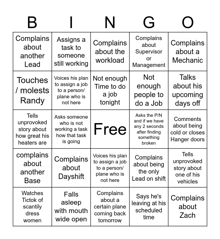This bingo card has a free space and 26 words: Voices his plan to assign a job to a person/ plane who is not here, Says he's leaving at his scheduled time, Not enough Time to do a job tonight, Falls asleep with mouth wide open, Complains about a Mechanic, Complains about another Lead, Touches / molests Randy, Assigns a task to someone still working, Comments about being cold or closes Hanger doors, Complains about being the only Lead on shift, Not enough people to do a Job, Tells unprovoked story about how great his heaters are, Tells unprovoked story about one of his vehicles, Watches Tictok of scantily dress women, Asks someone who is not working a task how that task is going, Complains about Planning or Maintenance control, Complains about Supervisor or Management, complains about another Base, Complains about the workload, Complains about Zach, Talks about his upcoming days off, Complains about a certain plane coming back tomorrow, Asks the P/N and if we have any 2 seconds after finding something broken, Complains about Dayshift, Voices his plan to assign a job to a person/ plane who is not here and Tells story about his weekend to the same person for the 3rd time.