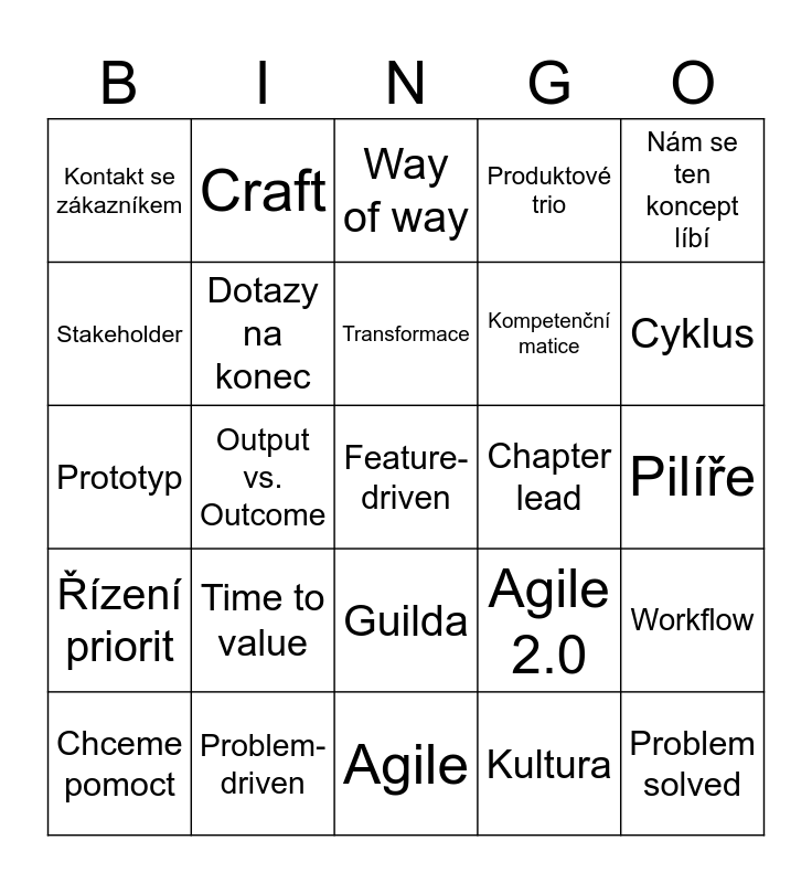 This bingo card has 25 words: Time to value, Agile, Transformace, Chceme pomoct, Nám se ten koncept líbí, Kontakt se zákazníkem, Stakeholder, Craft, Chapter lead, Guilda, Kompetenční matice, Prototyp, Agile 2.0, Workflow, Dotazy na konec, Problem solved, Pilíře, Way of way, Cyklus, Output vs. Outcome, Feature-driven, Problem-driven, Řízení priorit, Produktové trio and Kultura.