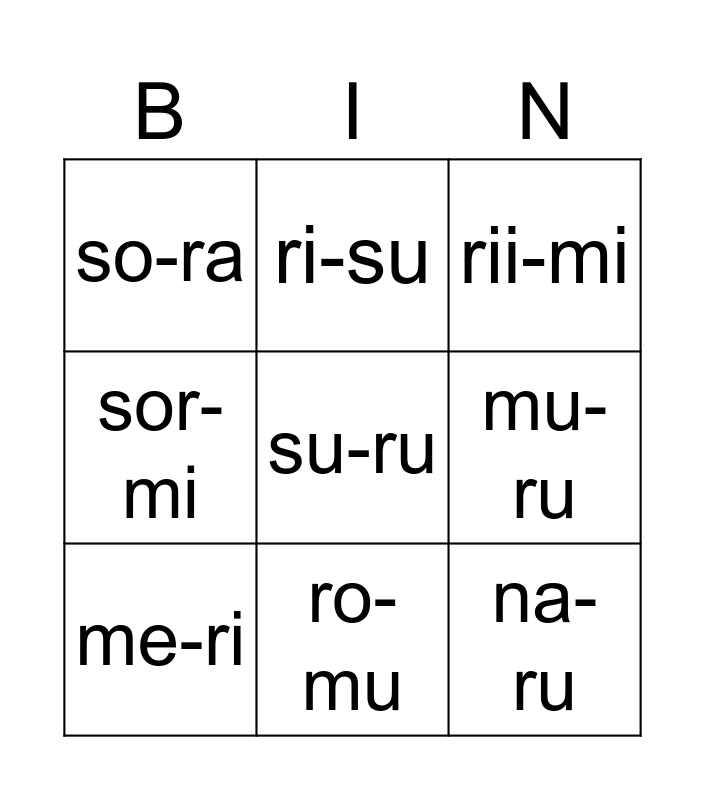 This bingo card has a free space and 8 words: mu-ru, rii-mi, ri-su, me-ri, so-ra, na-ru, sor-mi and ro-mu.