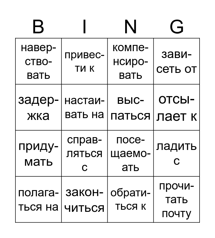 This bingo card has 16 words: закон- читься, ладить с, компе- нсиро- вать, навер- ство- вать, приду- мать, привес- ти к, посе- щаемо- ать, обрати- ться к, задер- жка, настаи- вать на, полага- ться на, зави-сеть от, справ- ляться с, отсы- лает к, выс- паться and прочи- тать почту.