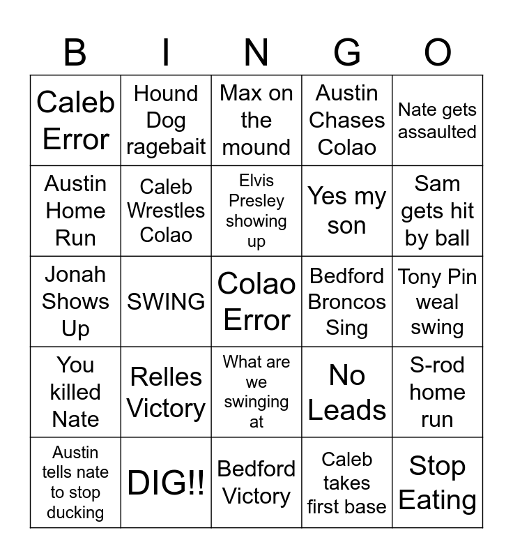 This bingo card has 35 words: Jonah Tong on the mound, Colao Slides into First base, Willbills is dead, Caleb Wrestles Colao, What are we swinging at, Austin Chases Colao, Austin Home Run, Nate walks Austin, Elvis Presley showing up, THAT'S A STRIKE, Jonah Shows Up, Nate gets assaulted, HEAT (Free), Nate's Girlfriend shows up, Caleb Error, Bedford Broncos Sing, Caleb takes first base, SWING, You killed Nate, Colao Error, No Leads, Austin tells nate to stop ducking, S-rod home run, DIG!!, Max on the mound, Sam gets hit by ball, Stop Eating, Home Run stolen, Yes my son, Tony Pin weal swing, Austin Crashout, Bedford Victory, Relles Victory, Hound Dog ragebait and ball lands on bus.
