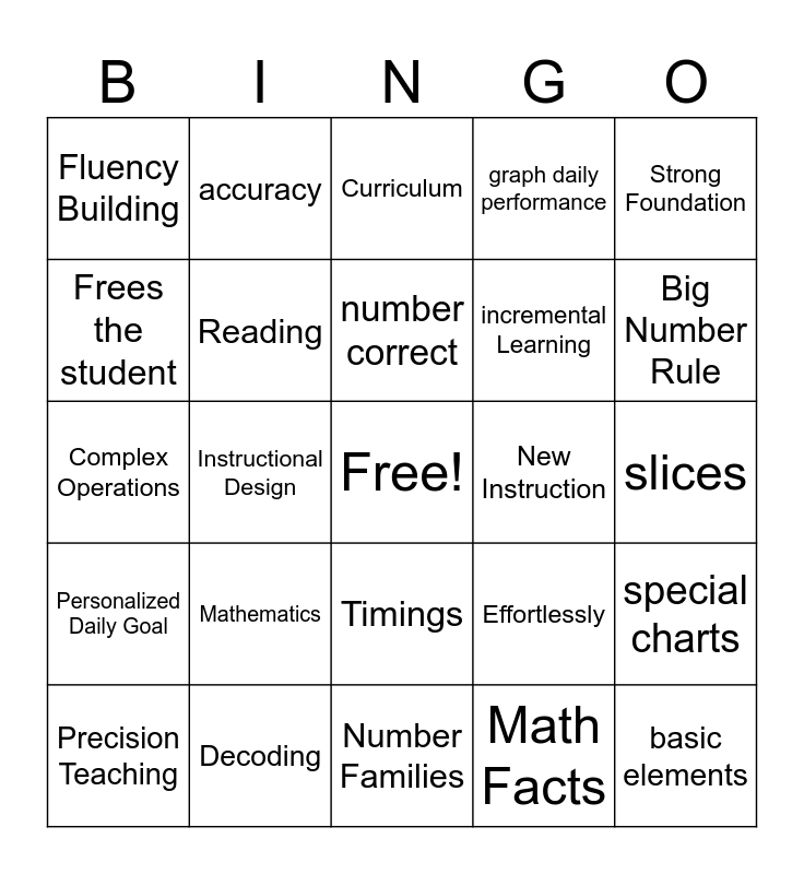 This bingo card has a free space and 29 words: Precision Teaching, Explicit Instruction, Instructional Design, Fluency, Fluency Building, Curriculum, Reading, Mathematics, New Instruction, Decoding, slices, basic elements, Number Families, Math Facts, Big Number Rule, Isolated, Timings, Personalized Daily Goal, Strong Foundation, Complex Operations, Effortlessly, Frequency Aims, incremental Learning, Frees the student, graph daily performance, accuracy, special charts, number correct and number of errors.