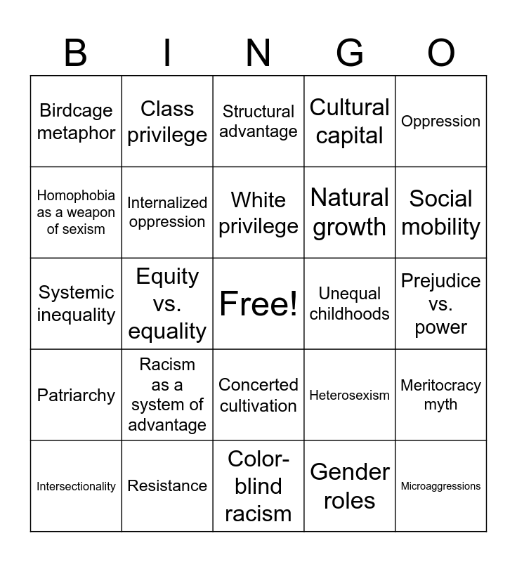 This bingo card has a free space and 25 words: Racism as a system of advantage, Color-blind racism, White privilege, Intersectionality, Oppression, Birdcage metaphor, Homophobia as a weapon of sexism, Class privilege, Unequal childhoods, Concerted cultivation, Natural growth, Systemic inequality, Heterosexism, Meritocracy myth, Internalized oppression, Allyship, Prejudice vs. power, Structural advantage, Social mobility, Equity vs. equality, Microaggressions, Resistance, Patriarchy, Cultural capital and Gender roles.