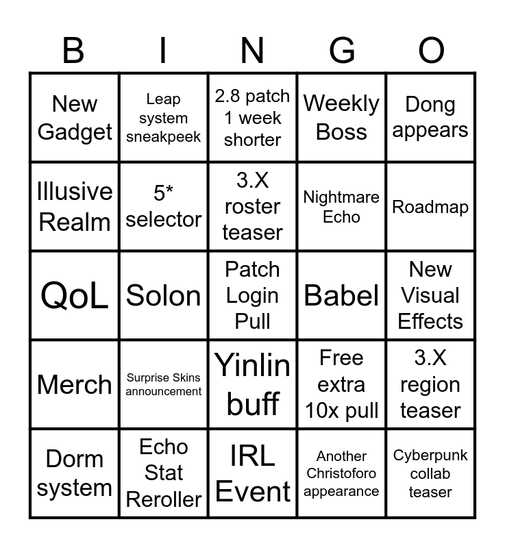 This bingo card has a free space and 24 words: Surprise Skins announcement, Echo Stat Reroller, 3.X roster teaser, Dorm system, Dong appears, New Gadget, Illusive Realm, Leap system sneakpeek, Babel, Yinlin buff, Nightmare Echo, QoL, Free extra 10x pull, 3.X region teaser, 5* selector, Another Christoforo appearance, New Visual Effects, 2.8 patch 1 week shorter, Roadmap, Solon, Cyberpunk collab teaser, Merch, Weekly Boss and IRL Event.