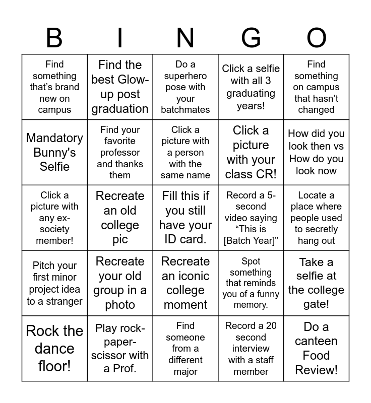 This bingo card has a free space and 24 words: Recreate your old group in a photo, Play rock-paper-scissor with a Prof., Click a picture with a person with the same name, Rock the dance floor!, Find something on campus that hasn’t changed, Find something that’s brand new on campus, Mandatory Bunny's Selfie, Find the best Glow-up post graduation, Record a 5-second video saying “This is [Batch Year]", Recreate an iconic college moment, Click a picture with your class CR!, Click a picture with any ex-society member!, Spot something that reminds you of a funny memory., Take a selfie at the college gate!, Find your favorite professor and thanks them, Record a 20 second interview with a staff member, Locate a place where people used to secretly hang out, Do a superhero pose with your batchmates, How did you look then vs How do you look now, Recreate an old college pic, Do a canteen Food Review!, Pitch your first minor project idea to a stranger, Click a selfie with all 3 graduating years! and Find someone from a different major.