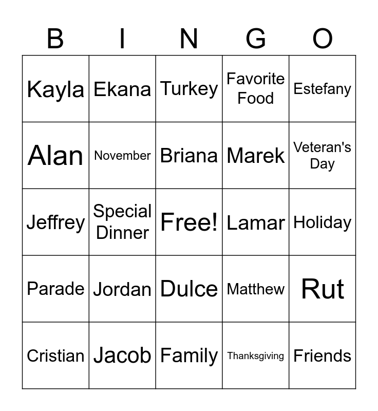 This bingo card has a free space and 24 words: Jordan, Jacob, Briana, Cristian, Estefany, Kayla, Alan, Ekana, Lamar, Dulce, Marek, Jeffrey, Matthew, Rut, November, Thanksgiving, Holiday, Turkey, Veteran's Day, Special Dinner, Friends, Parade, Favorite Food and Family.