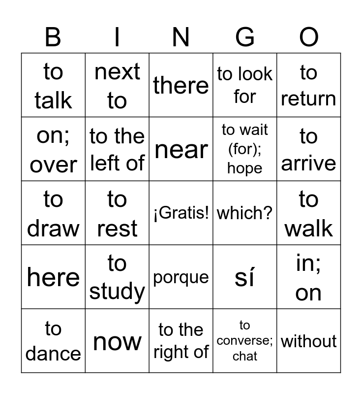 This bingo card has a free space and 24 words: to study, now, near, to dance, to return, to talk, on; over, next to, which?, porque, to wait (for); hope, to draw, sí, in; on, to the left of, to converse; chat, to walk, there, to arrive, to rest, without, here, to look for and to the right of.