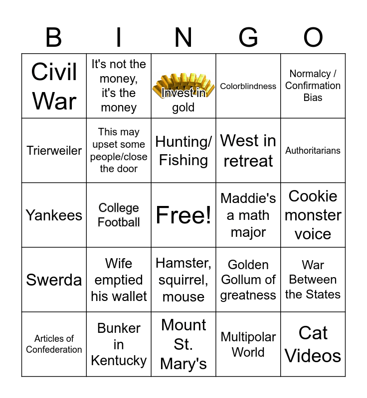 This bingo card has 2 images, a free space and 29 words: Articles of Confederation, Rugby, College Football, Boomers are evil, Civil War, Invest in gold, This may upset some people/close the door, Wife emptied his wallet, Maddie's a math major, Bunker in Kentucky, Cookie monster voice, Cat Videos, Mount St. Mary's, Multipolar World, Authoritarians, Mr. Vanderwooed, Hamster, squirrel, mouse, Swerda, Normalcy / Confirmation Bias, Yankees, Golden Gollum of greatness, Ultramontanists, West in retreat, Trierweiler, Colorblindness, It's not the money, it's the money, War Between the States, Hunting/ Fishing and Gen Z & Trades.