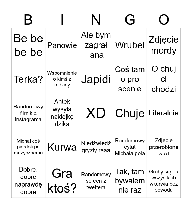 This bingo card has a free space and 24 words: Kurwa, Gra ktoś?, Japidi, Dobre, dobre naprawdę dobre, Zdjęcie mordy, Be be be be, Terka?, Panowie, Chuje, Niedźwiedź gryzły raaa, Coś tam o pro scenie, Randomowy filmik z instagrama, Randomowy cytat Michała pola, Zdjęcie przerobione w AI, Wspomnienie o kimś z rodziny, Tak, tam bywałem nie raz, Literalnie, Ale bym zagrał lana, O chuj ci chodzi, Antek wysyła naklejkę dzika, Gruby się na wszystkich wkurwia bez powodu, Michał coś pierdoli po muzycznemu, Wrubel and Randomowy screen z twettera.