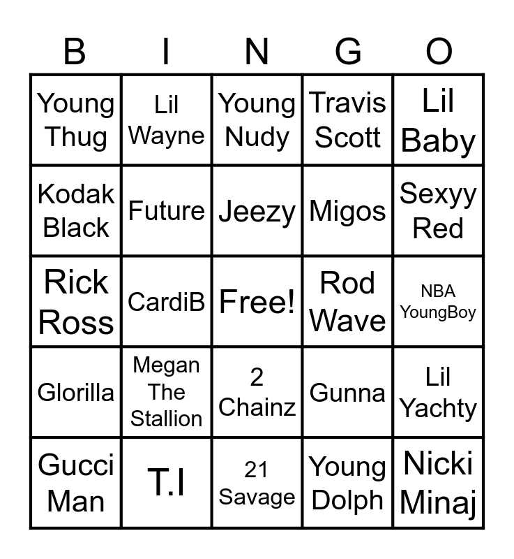 This bingo card has a free space and 24 words: Megan The Stallion, T.I, Jeezy, Gucci Man, Lil Baby, Young Thug, Kodak Black, Lil Wayne, Rod Wave, 2 Chainz, Migos, Rick Ross, Gunna, Lil Yachty, Future, Young Dolph, NBA YoungBoy, Young Nudy, Sexyy Red, CardiB, Nicki Minaj, Glorilla, Travis Scott and 21 Savage.